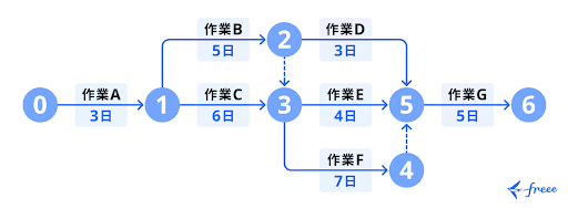 具体的には、それぞれの作業を矢印で結び、さらに作業の始まりと終わりの部分に印をつけることで作成していきます。