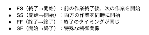 ネットワーク工程表には、以下の4種類で作業のつながりを表していきます。