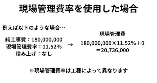 一方で、現場管理費率を使って計算する場合は以下の計算式を用いるのが一般的です。