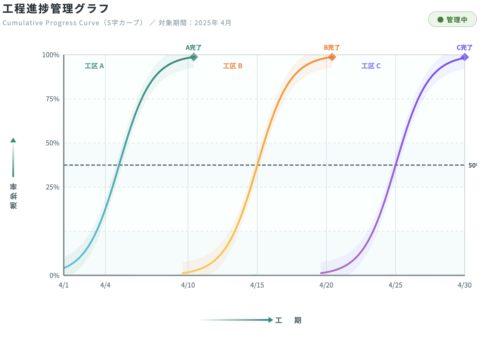 工程管理曲線は、横軸に工期、縦軸に進捗率をとり、工事全体の進み具合をS字カーブで描く手法です。