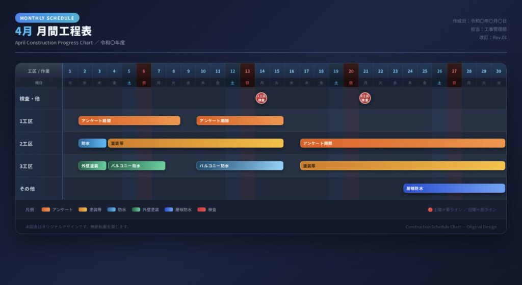 具体的には、工種ごとに色分けを徹底したり、重要な節目となる日(材料搬入日や検査日など)には目立つアイコンを配置したりする工夫が有効です。