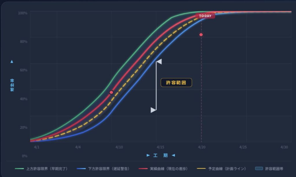 予定と実績のズレをグラフの「傾き」として捉えることで、現場の異変をいち早く察知し、工期遅延などのリスクを未然に防ぐことができます。