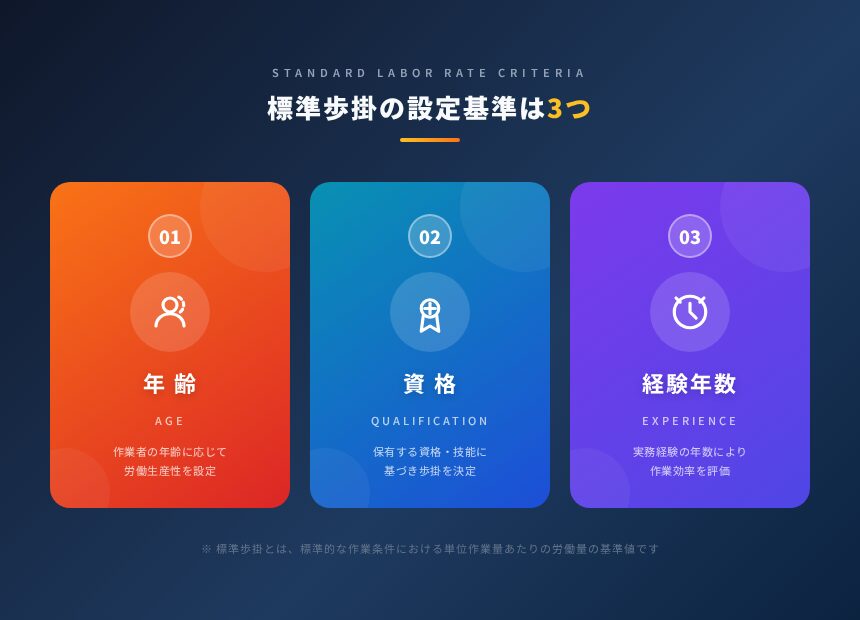 また、標準歩掛は以下の3つの基準により定められています。